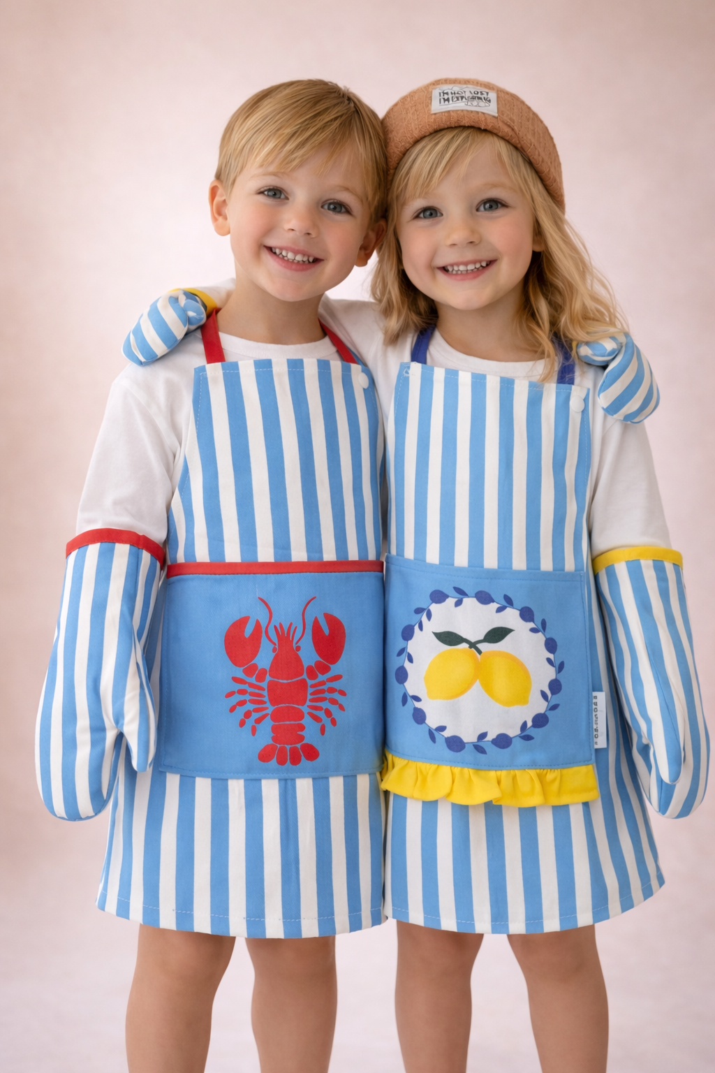 Made for little ones who love all things summer and fun! Our coastal vibes apron is a darling mix of Summer hues, and the dreamiest Amalfi coast details. Perfect for baking days, arts and crafts, or pretend tea parties.