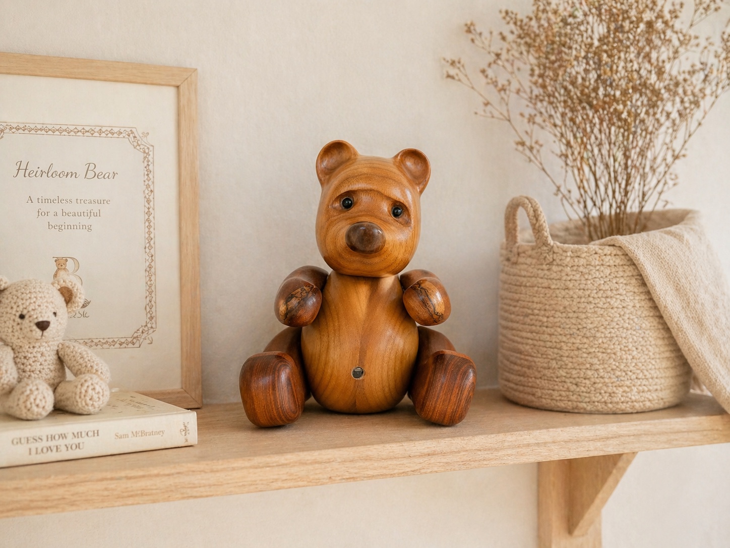 Crafted from solid wood and carefully hand-carved, each Heirloom Bear is a timeless piece designed to be treasured for generations. Every curve is shaped by hand, allowing the natural grain of the wood to shine through — making each bear completely unique.